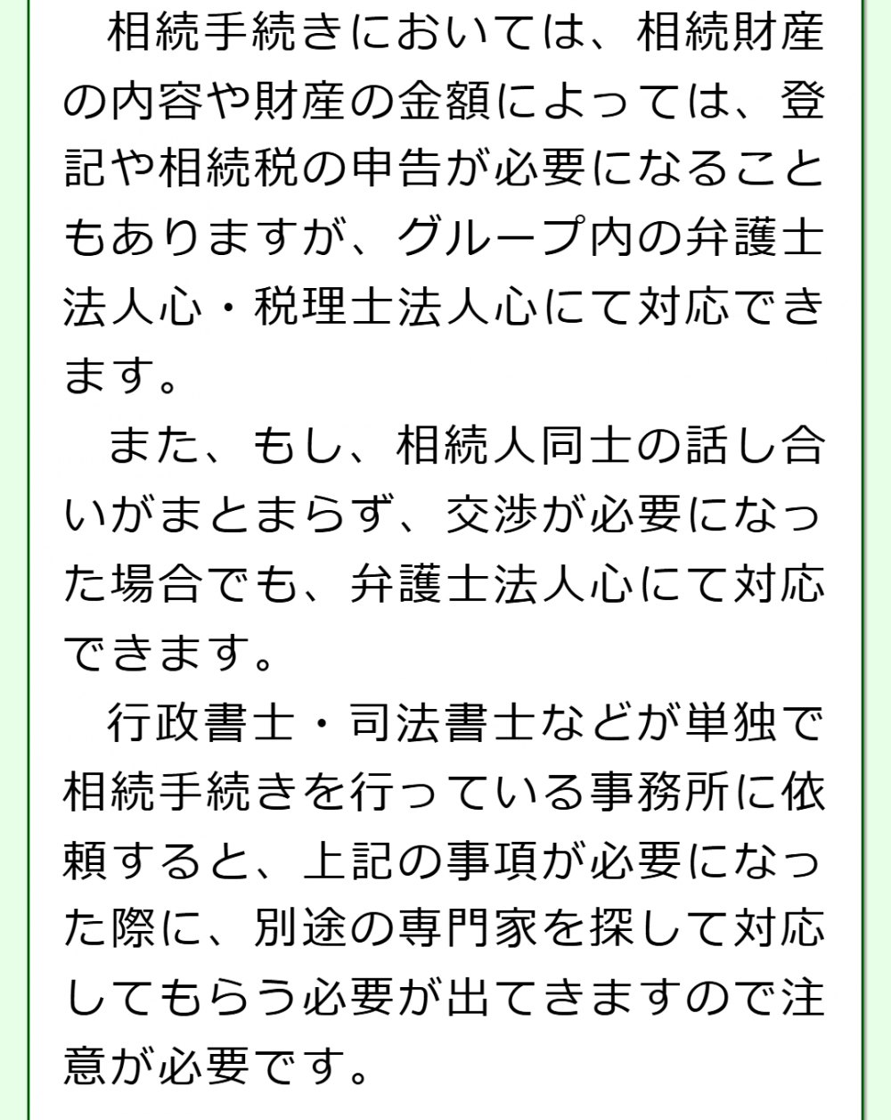 不動産の相続登記は司法書士、相続税申告は税理士、紛争対応は弁護士の業務であり、行政書士は扱うことができません。