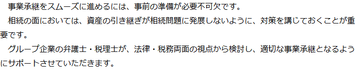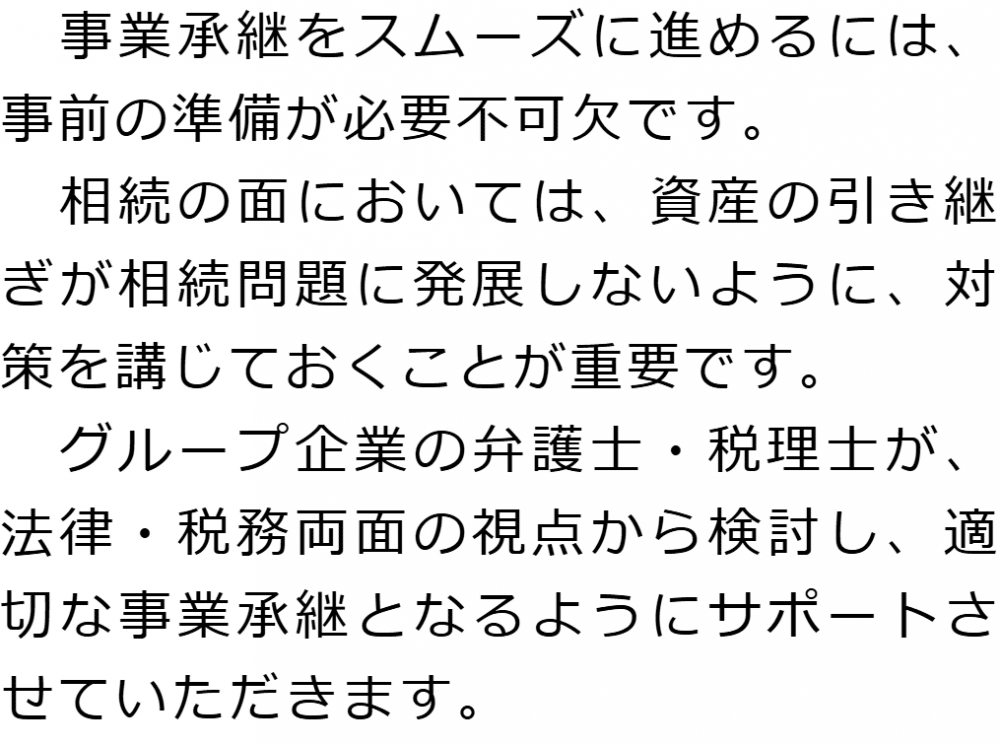 トップ業務内容事業承継 階層構造▼ 業務内容(目次) 事業承継 業務内容(目次)業務内容トップ行政書士法人心の業務内容遺言遺産整理相続人調査相続財産調査遺産分割協議書の作成預金・貯金の解約・名義変更証券口座の解約・名義変更自動車の名義変更心グループのその他の業務内容家族信託・民事信託節税対策事業承継遺言の検認相続放棄限定承認遺産分割遺留分侵害額請求相続登記相続税申告相続税調査 受付時間 平日 9時~21時、土日祝 9時~18時 夜間・土日祝の相談も対応します (要予約) 所在地 〒243-0018 神奈川県厚木市中町3-12-1厚木国際ビル6F 0120-2403-39 お問合せ・アクセス・地図