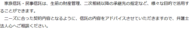 トップ業務内容家族信託・民事信託 階層構造▼ 業務内容(目次) 家族信託・民事信託 業務内容(目次)業務内容トップ行政書士法人心の業務内容遺言遺産整理相続人調査相続財産調査遺産分割協議書の作成預金・貯金の解約・名義変更証券口座の解約・名義変更自動車の名義変更心グループのその他の業務内容家族信託・民事信託節税対策事業承継遺言の検認相続放棄限定承認遺産分割遺留分侵害額請求相続登記相続税申告相続税調査 受付時間 平日 9時~21時、土日祝 9時~18時 夜間・土日祝の相談も対応します (要予約) 所在地 〒243-0018 神奈川県厚木市中町3-12-1厚木国際ビル6F 0120-2403-39 お問合せ・アクセス・地図