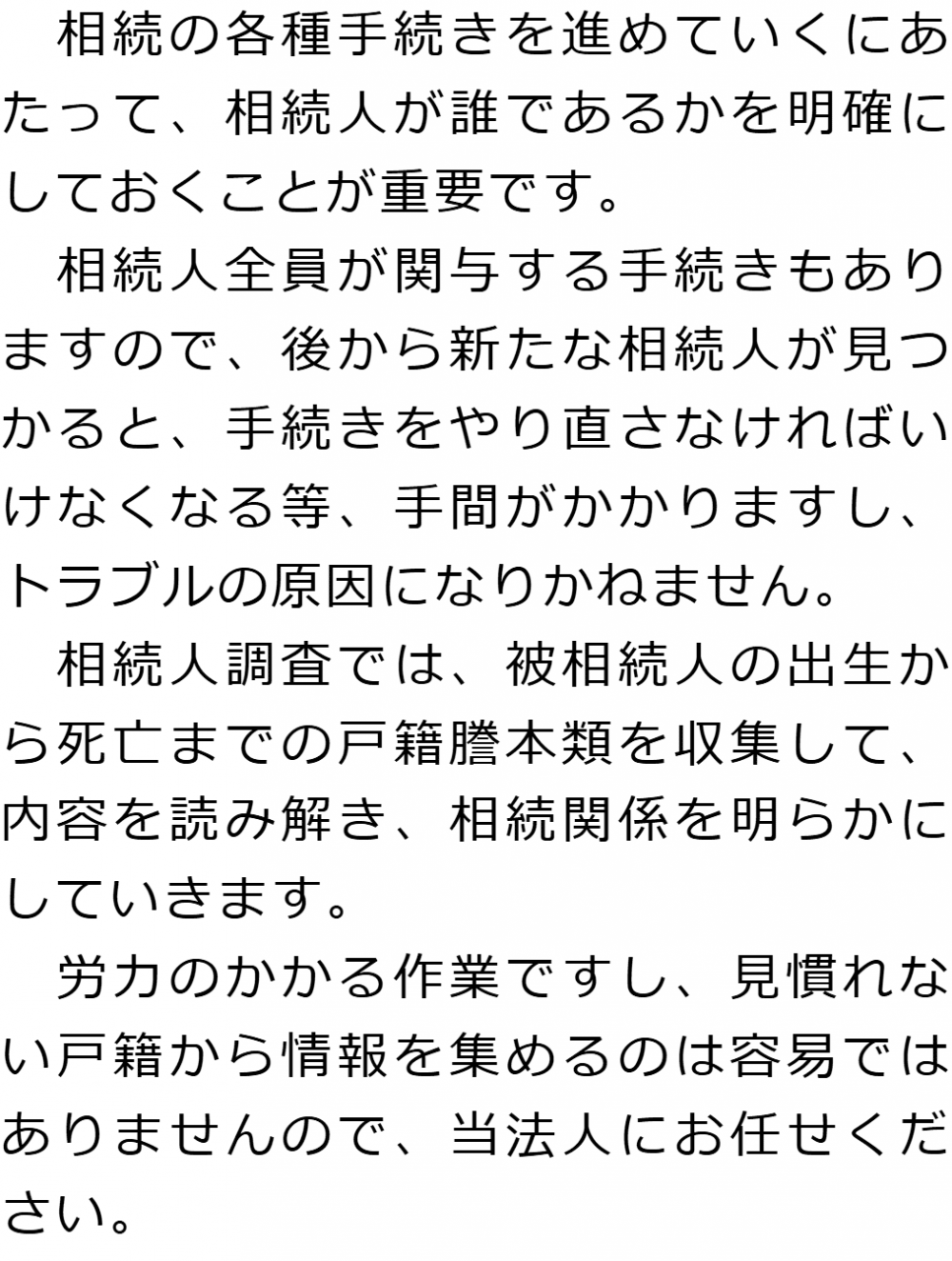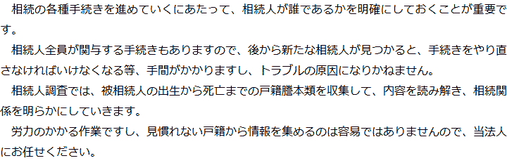 トップ業務内容相続人調査 階層構造▼ 業務内容(目次) 相続人調査 業務内容(目次)業務内容トップ行政書士法人心の業務内容遺言遺産整理相続人調査相続財産調査遺産分割協議書の作成預金・貯金の解約・名義変更証券口座の解約・名義変更自動車の名義変更心グループのその他の業務内容家族信託・民事信託節税対策事業承継遺言の検認相続放棄限定承認遺産分割遺留分侵害額請求相続登記相続税申告相続税調査 受付時間 平日 9時~21時、土日祝 9時~18時 夜間・土日祝の相談も対応します (要予約) 所在地 〒243-0018 神奈川県厚木市中町3-12-1厚木国際ビル6F 0120-2403-39 お問合せ・アクセス・地図