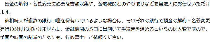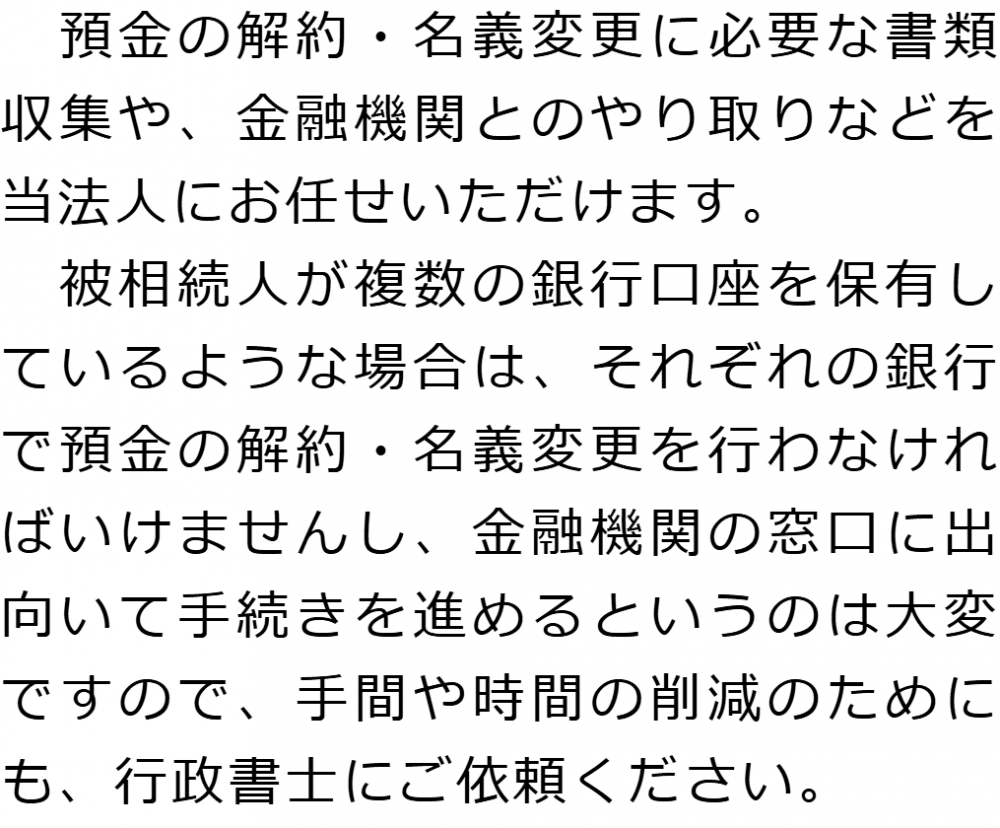 トップ業務内容預金・貯金の解約・名義変更 階層構造▼ 業務内容(目次) 預金・貯金の解約・名義変更 業務内容(目次)業務内容トップ行政書士法人心の業務内容遺言遺産整理相続人調査相続財産調査遺産分割協議書の作成預金・貯金の解約・名義変更証券口座の解約・名義変更自動車の名義変更心グループのその他の業務内容家族信託・民事信託節税対策事業承継遺言の検認相続放棄限定承認遺産分割遺留分侵害額請求相続登記相続税申告相続税調査 受付時間 平日 9時~21時、土日祝 9時~18時 夜間・土日祝の相談も対応します (要予約) 所在地 〒243-0018 神奈川県厚木市中町3-12-1厚木国際ビル6F 0120-2403-39 お問合せ・アクセス・地図